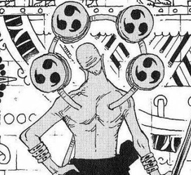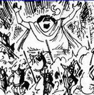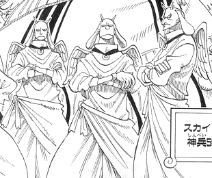 この他エネルが神になったあとの世話係たちが28巻最初のほうにたくさんでてきますが、全員神官と同じかっこうです。ちなみにこの羽根と翼ですが、ONE PIECE YELLOW(p163)では装飾品だと書かれていました。これは勝手な想像ですが、元は本物の羽根や翼でも地球で混血になることで血が薄れてなくなったけど高度な文明を持ち込んだ先祖を誇りに思い代々つけているのではないでしょうか。