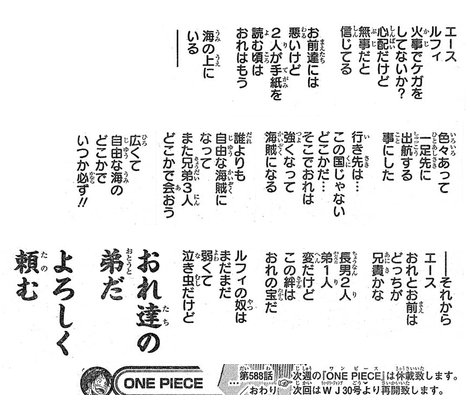 今後の展開ですがとりあえず過去編の中でもサボ編が終りました。このあとまだエース旅立ち編までやるんでしょうか?やるとしたらまだ2週間はかかりそうです。とりあえず来週は休載です。