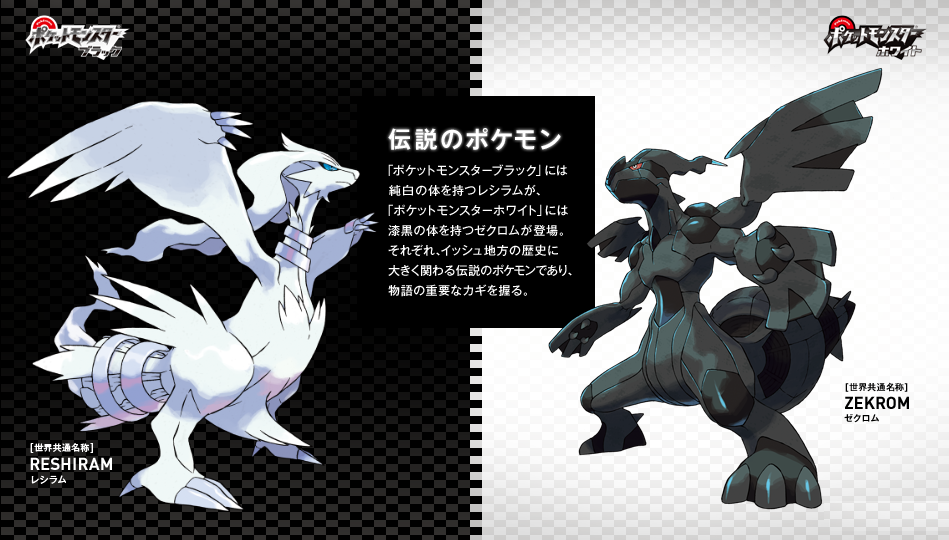 左の白いのがレシラムで右の黒いのがゼクロムというらしいです。前作あたりから伝説のポケモンは妙にゴツゴツしています。また同じく前作あたりから見た目で属性がわかりにくくなりました。