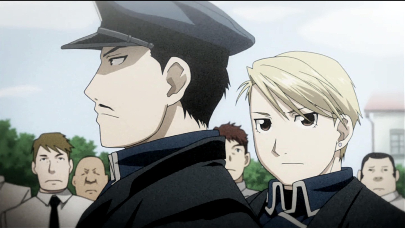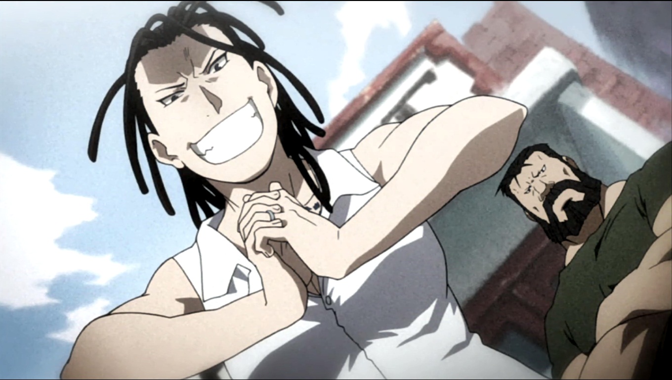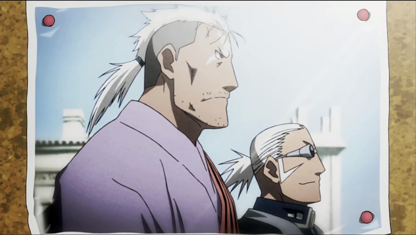 今日はアニメのほうの最終回見ていきました。原作ではエドの旅立ちで終わっていますが、アニメではその後のキャラたちが写真で少しだけ描かれていました。 スカーとマイルズの二人ですが劇中の話通りイシュヴァール復興のために赴いたようです。注目なのはスカーの髪型!髪を伸ばして後ろでくくっています。スカーは戦士だったんで動きやす髪型にしていて、戦いが終わったので伸ばしたのでしょうか?微妙に生えてるヒゲを考えると切るのが面倒だったのかな?