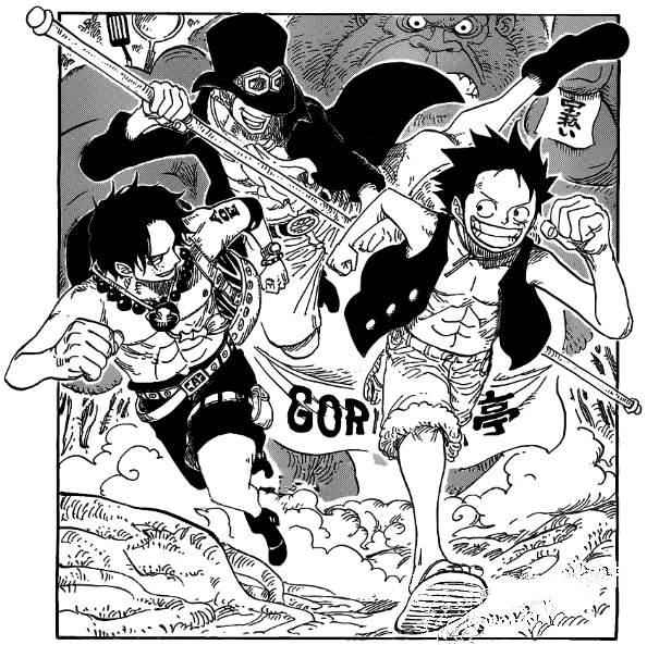・表紙 今回はルフィ・エース・サボが表紙をかざたのですが、気になるのはエースのイレズミです。本編のときとは違ってACEと書かれています 比べてみるとCの中あった点もなくなっています。やはりこの文字はもともとはAS・Lつまりエースサボ・ルフィの三人の絆を掘っていたのではないでしょうか?しかし、この扉絵の世界ではサボが生きているのSに×はつくこともなく、絵自体が絆を表しているのでACE(エース)となっているのではないでしょうか?