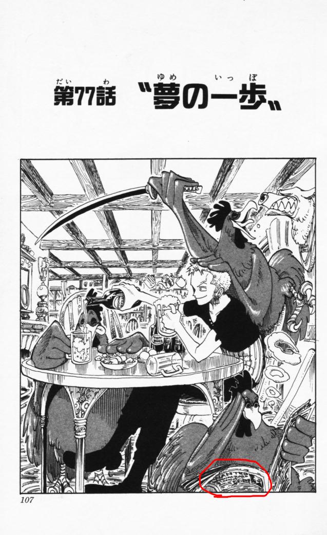 これは77話の扉絵である。鳥が読んでいる新聞の赤丸している部分に注目してもらいたい。