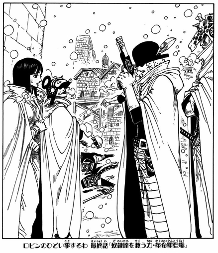 登場時はキリンの方にカク?と注目が集まりましたが今度は銃を持っているのがサボと注目が集まりそうです。またこのサブタイトルでもわかるように革命軍は奴隷など差別を非常に嫌っているようです。