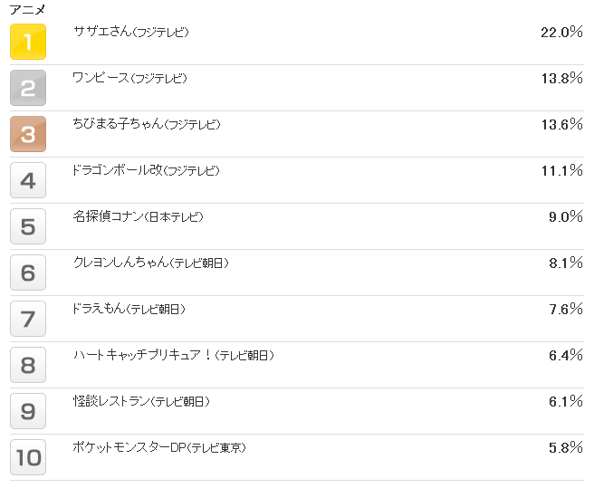 あと他の視聴率も見ると、怪談レストラン、スティッチより視聴率高いんなら先にやって欲しいな。半からだとよく見忘れてしう~。それとポケモンはストーリーもので原作もなく10年以上続くと流石に世代交代で視聴率低いですね