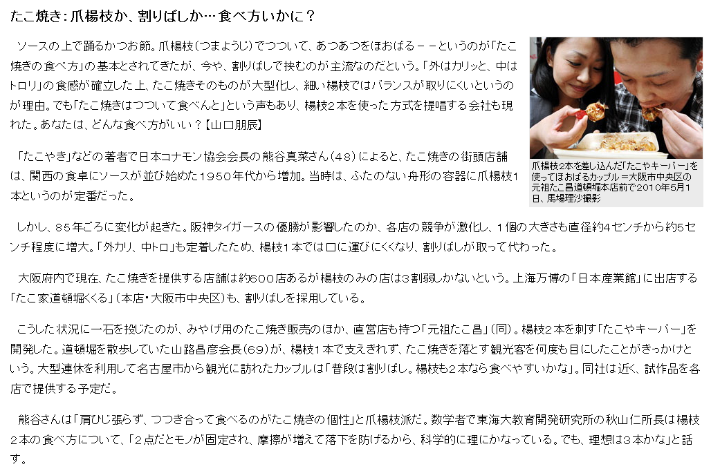 あなたはたこ焼きは割り箸で食べたいですか?それとも爪楊枝で食べたいかという記事が載っている